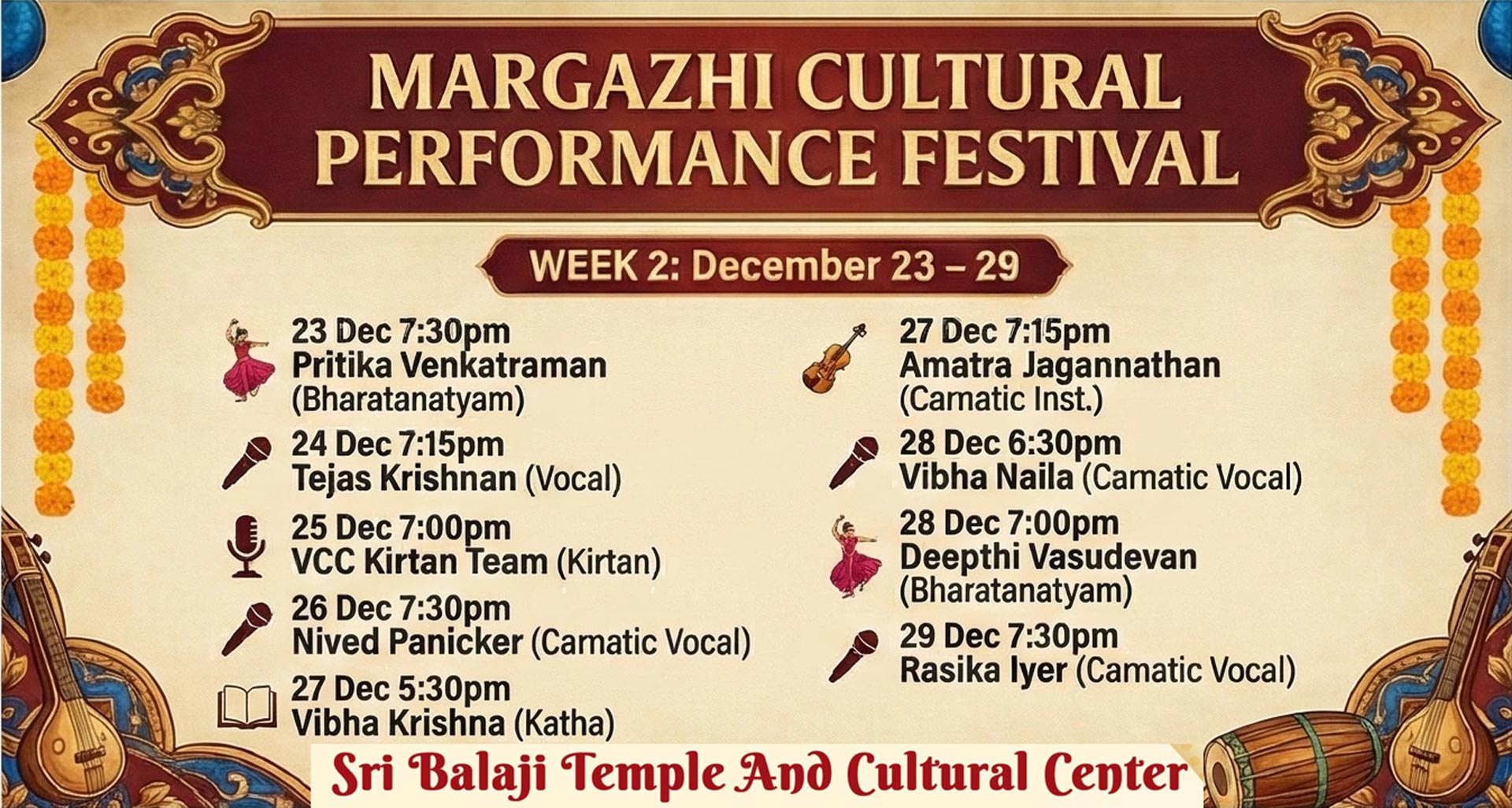 Sunday, Dec 28 – 6:30 pm: 🎤 Vibha Nalla (Carnatic Vocal)