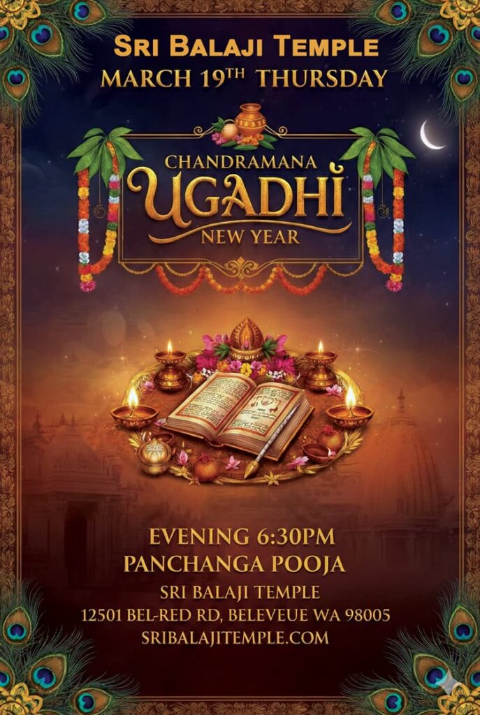 Namaskaram! You are cordially invited to join us in celebrating Chandramana Ugadi (New Year) at Sri Balaji Temple.